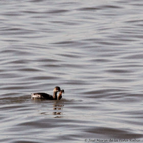 La variedad de aves acuáticas en este lugar es grande y alberga a otras familias com especies como el somormujo lavanco (Podiceps cristatus) y el zampullín cuellinegro (Podiceps nigricollis). El primero, como ya adelanté en la entrada Cambios de plumaje. Época reproductora del 10 de marzo, posee un singular método de cortejo y por aquel entonces pudimos observar algunas persecuciones y ensayos de los famosos "bailes". Además de esta maravilla también fuimos capaces de corroborar la voracidad del zampullín, que aunque pequeño, nos mostró la facilidad con la que se puede desmontar a un cangrejo de río.
