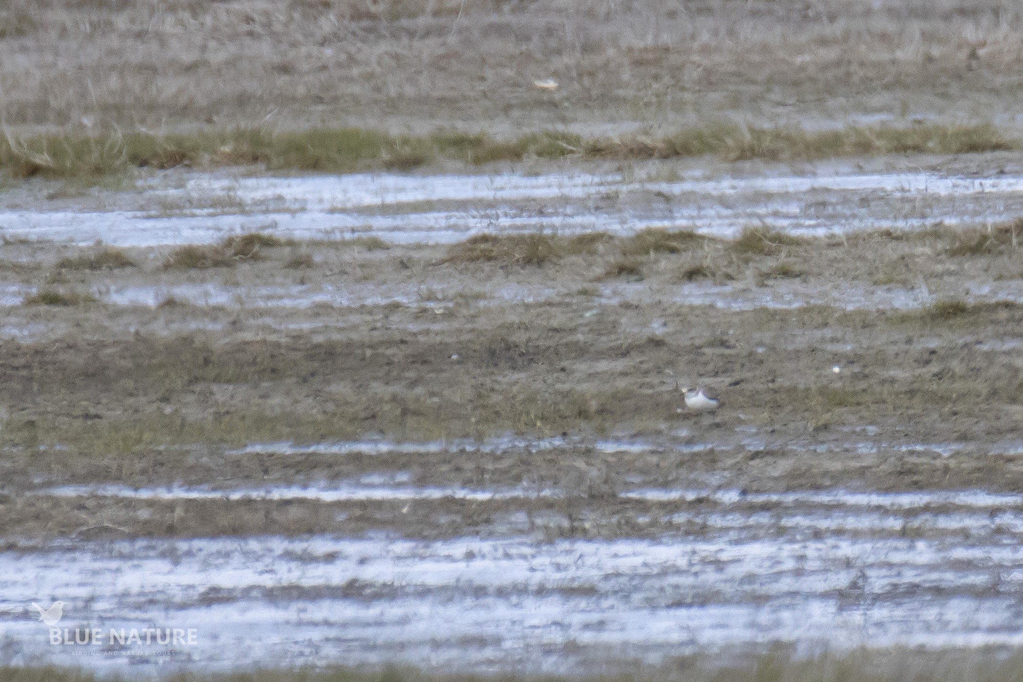 Fuera del agua escuchamos al buitrón, al cetia ruiseñor y en un momento, aunque fugaz pudimos ver y escuchar a una hembra de bigotudo. El día, extremadamente ventoso, no facilitaba la localización de estas aves entre el carrizo, que quedaba zarandeado por el viento. Estuvimos un rato a ver si le volvíamos a ver pero no hubo suerte. Cuando llegó la hora de la comida, mientras unos se centraban en el bocata, otros localizamos una pareja de chorlitejo patinegro que también andaba rellenando el buche. Aunque estaban algo lejos, pudimos apreciar sus diferencias con el resto de chorlitejos.